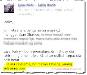Itu sahaja. Semoga tips ini sedikit sebanyak memberi manfaat utk ibu, bakal ibu, masyarakat sekeliling dan para suami juga..Jaga diri dan ingat Allah setiap masa.Jika bermasalah dari segi kuantiti dan kualiti susu badan, saya sarankan anda cuba dari rangkaian Set Menyusu Terbaik Shaklee(Klik Disini) ini.